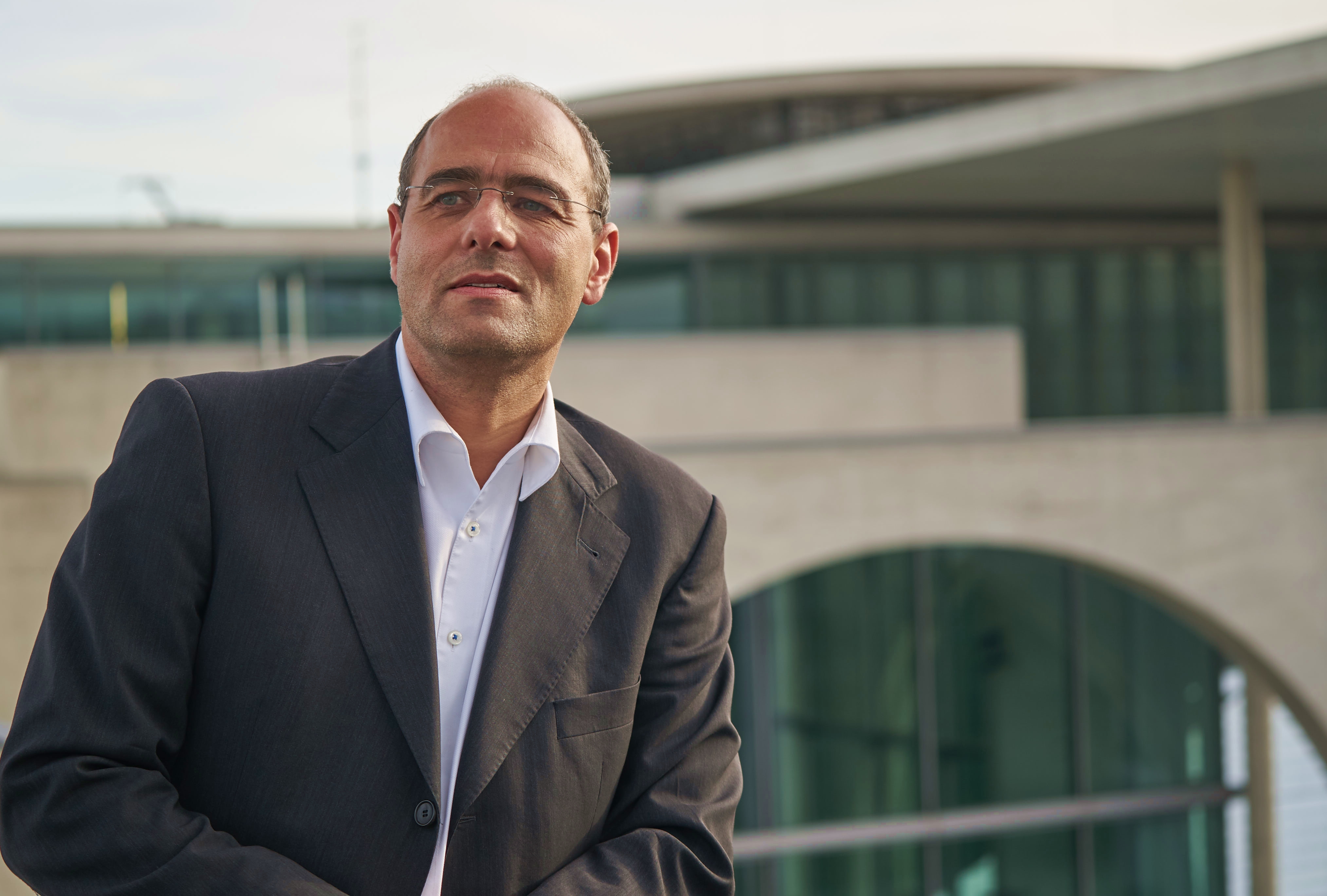 - MdB Boehringer vor Nordturm des Reichstagsgebäudes und Europasaal des Paul Löbe Hauses; Bild: H. Dreblow