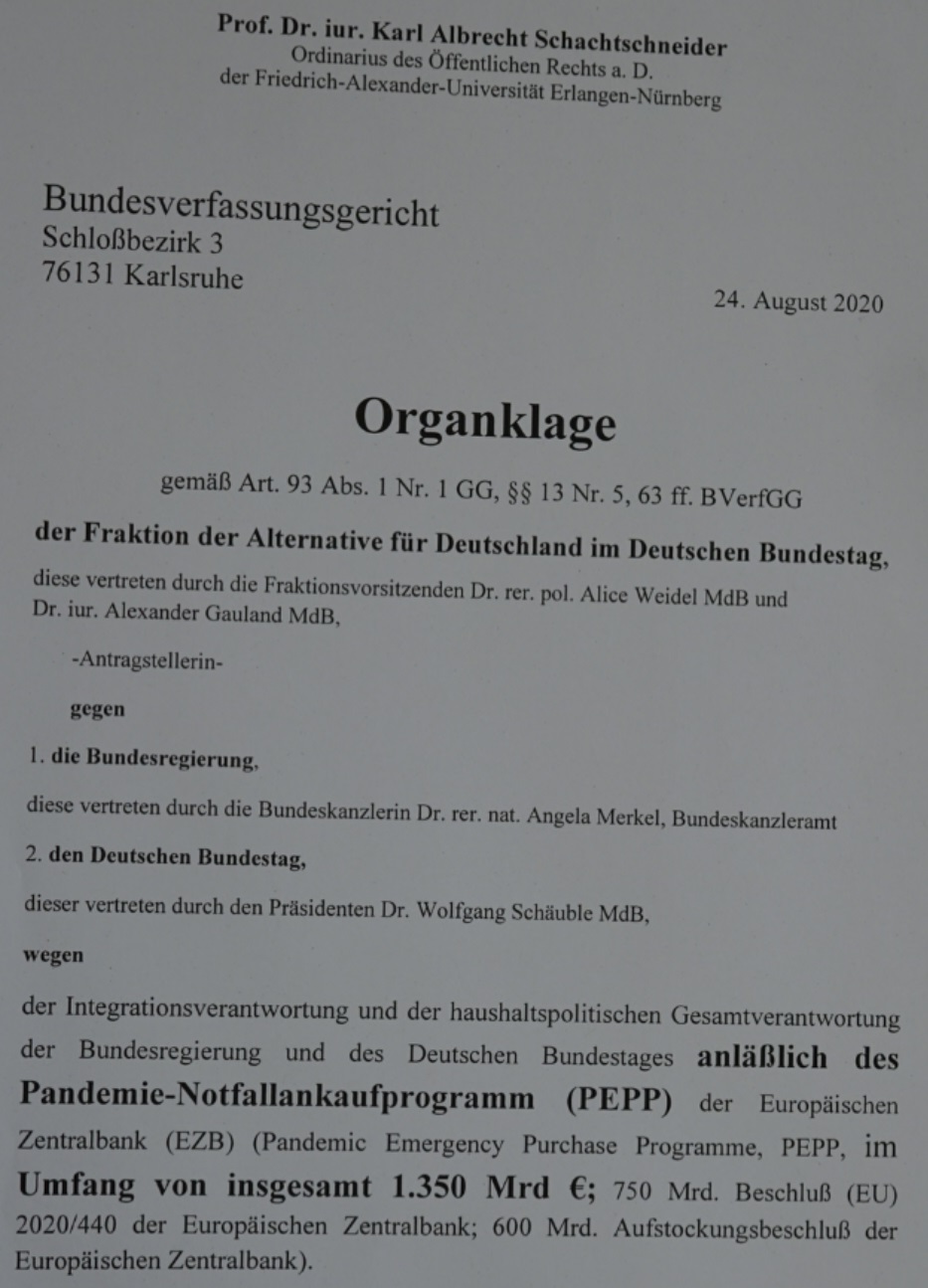 Die AfD-Fraktion wird in sogenannter Prozessstandschaft für den Deutschen Bundestag gemäß § 64 BVerfGG klagen. Wir sehen den Bundestag in seinen Rechten verletzt, weil die Bundesregierung – sowie auch der Bundestag selbst – es unterlassen haben, das PEPP-Programm schnell beziehungsweise rechtzeitig mit geeigneten Mitteln zu unterbinden. Die Bundesregierung hätte aufgrund der offenkundigen Verletzung der europäischen Verträge unverzüglich Nichtigkeitsklage nach Art. 263 AEUV wegen der Beschlüsse der EZB vom 18. und 24. März 2020 und vom 4. Juni 2020 erheben müssen, und der Bundestag hätte die Bundesregierung dazu verpflichten müssen. Das Hinnehmen von offenkundigen Vertragsverletzungen ist mit der Integrationsverantwortung und der haushaltspolitischen Gesamtverantwortung von Bundestag und Bundesregierung unvereinbar.